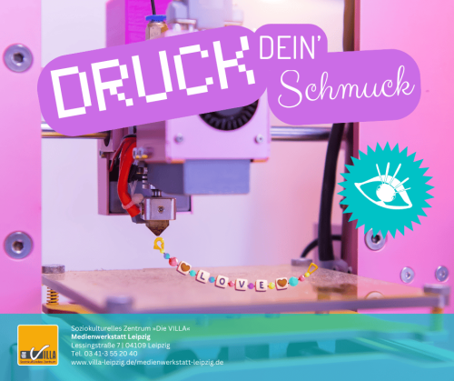 Beschreibung Im Workshop „Druck dein’ Schmuck“ entwerfen Kinder und Jugendliche eigene Schmuckstücke wie Anhänger, Ringe oder Schlüsselanhänger am Computer und erleben, wie diese anschließend mit dem 3D-Drucker zum Leben erweckt werden.