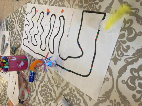 Sie lernen ihn zu kalibrieren und wie er sich mit Hilfe eines schwarzen Stifts auf dem Papier fortbewegt, um zum Beispiel Wettrennen zu fahren,