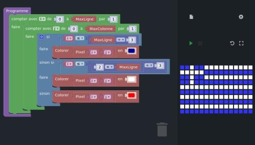 Dans cet atelier, tu pourras t’entraîner à créer toi aussi des images en Pixel Art en les programmant toi-même. Tu réaliseras ainsi des drapeaux de toutes les nationalités, et même un petit jeu interactif sur simulateur !