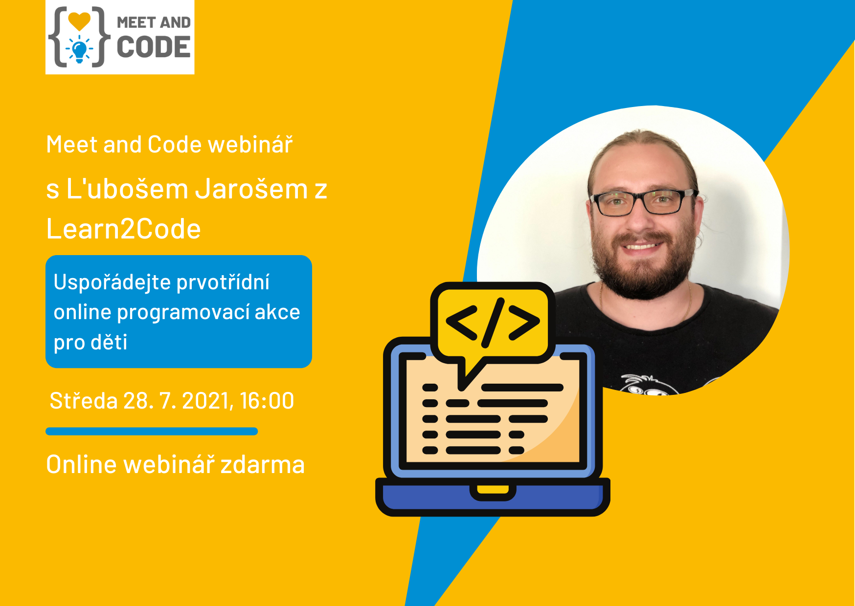 Jako poslední webinář v tomto roce jsme si pro vás schovali opravdovou lahůdku: workshop o tom, jak dělat online akce pro děti s Ľubošem Jarošem z Learn2Code.