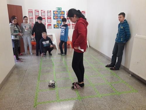 Zu Beginn wird das Koordinatensystem inklusiver aller mathematischen Begriffe besprochen. Danach erarbeiten die Teilnehmer einen Algorithmus um vom Nullpunkt zu einem Punkt im Koordinatensystem zu kommen. Zum Abschluss wird das Programm mit dem Roboter programmiert und so kalibriert, dass der Punkt möglichst genau erreicht wird.