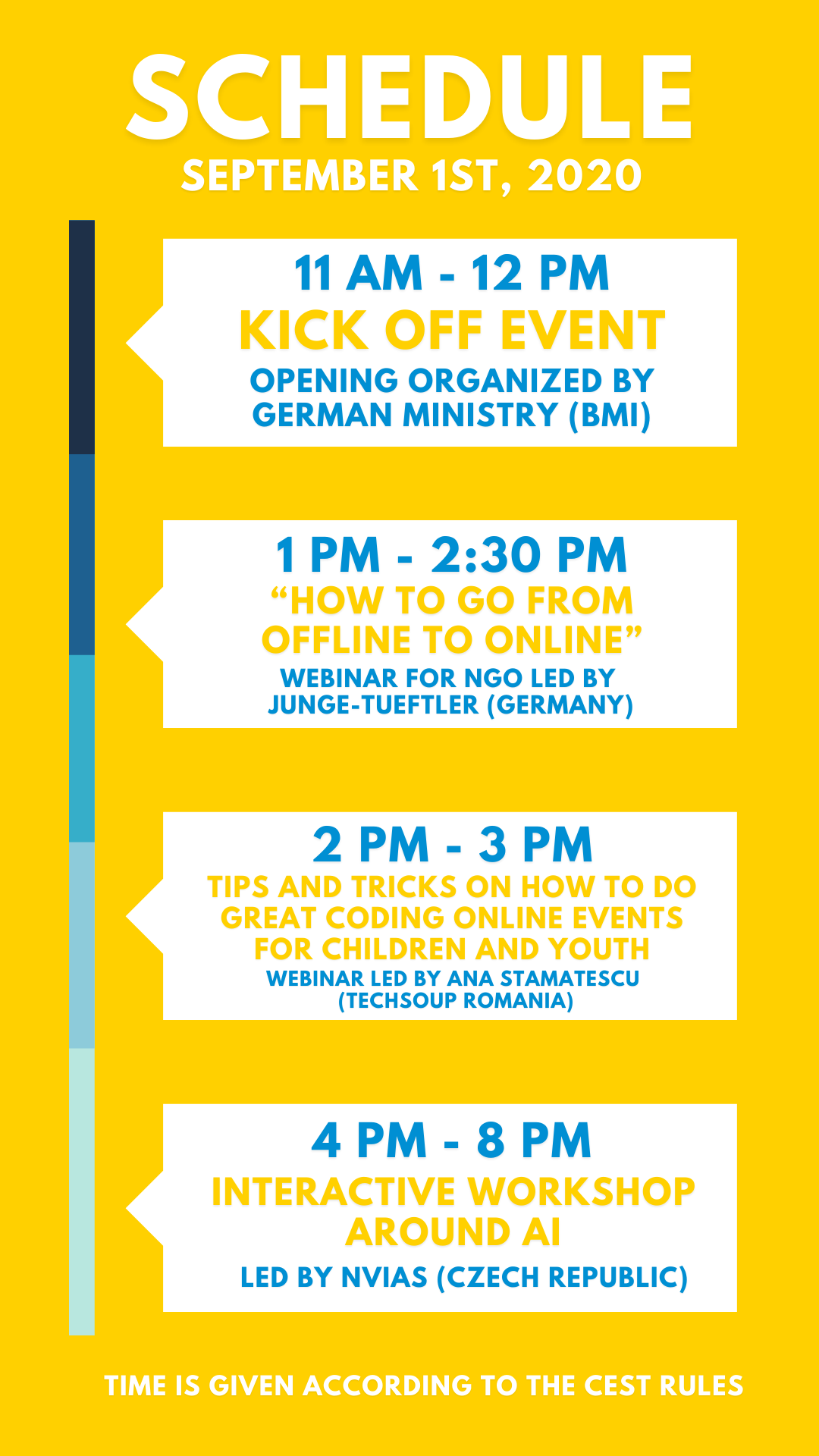 On September 1st, at 11.00 CET Germany‘s Federal Ministry of the Interior, Building and Community (BMI) including State Secretary Dr. Markus Richter for the Federal Ministry of the Interior, Hartmut Thomsen (President Middle & Eastern Europe, SAP) and Fabrizia Benini, Head of Unit Digital Economy and Skills, European Commission will virtually kick off Meet and Code 2020! Join one-hour livestream (11 a.m.-12 p.m.) to meet European nonprofits that already applied for our grants and to learn more about coding online to bring new digital skills to the younger generation.