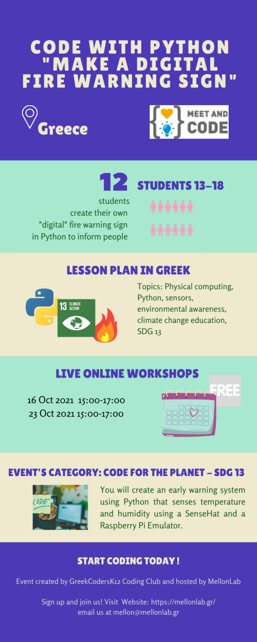 The event combines coding and actions for the planet, and improves climate change education through raising awareness of the dangers of massive wildfires, and the negative impact on human health. The event is aligned with the Sustainable Development Goal #13.