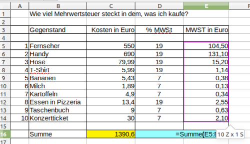 Die Kinder lernen zum ersten Mal Excel als Tabellenkalkulationsprogramm kennen. Wir üben Formatierungen und Aufzählungen durch Markieren und 'nach unten ziehen'. Dann bekommen die Kinder die Aufgabe, die Mehrwertsteuer der Ausgaben zu berechnen und zu addierent. Dabei lernen sie, Formeln in Feldern von Excel einzutragen und erkennen, dass das Kopieren der Formeln viel einfacher ist als alles einzeln z.B. mit dem Taschenrechner zu berechnen. Die erste Tabelle wird per Projektion erklärt, dann können die Kinder zu zweit eine eigene Tabelle erstellen. Die Kinder sind zwischen 12 und 15 Jahren alt, also zwischen 7. und 9. Klasse. Die Prozentrechnung wird in der 7. Klasse eingeführt und kann so auch bei Neuntklässlern noch mal wiederholt und gefestigt werden. Als Vertiefung bekommen die Kinder dann die Aufgabe zu prüfen, wie sich die Zahlen verändern, wenn z.B. wegen Corona nur 16 % MWST anfallen und als zweites Projekt könnte eine Tabelle mit Preissteigerungen erstellt werden (z.B. für Gas). Die Kinder erleben, dass man sehr schnell und einfach Werte verändern kann und in Excel sofort die Auswirkungen sieht, so dass sie die Vorteile eines Tabellenkalkulationsprogrammes erleben.